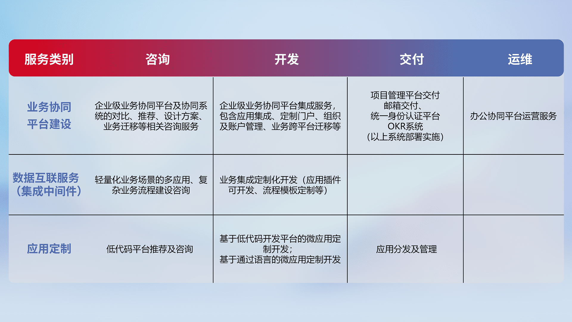 针对钉钉、、、、企微、、IDaas等平台级产品提供产品的规划、、方案、、交付、、定制化开发等服务,,,实现如统一协同办公、、智能客户服务、、混合会议管理、、智能数据查询、、等业务场景,,,实现数字化转型。。。