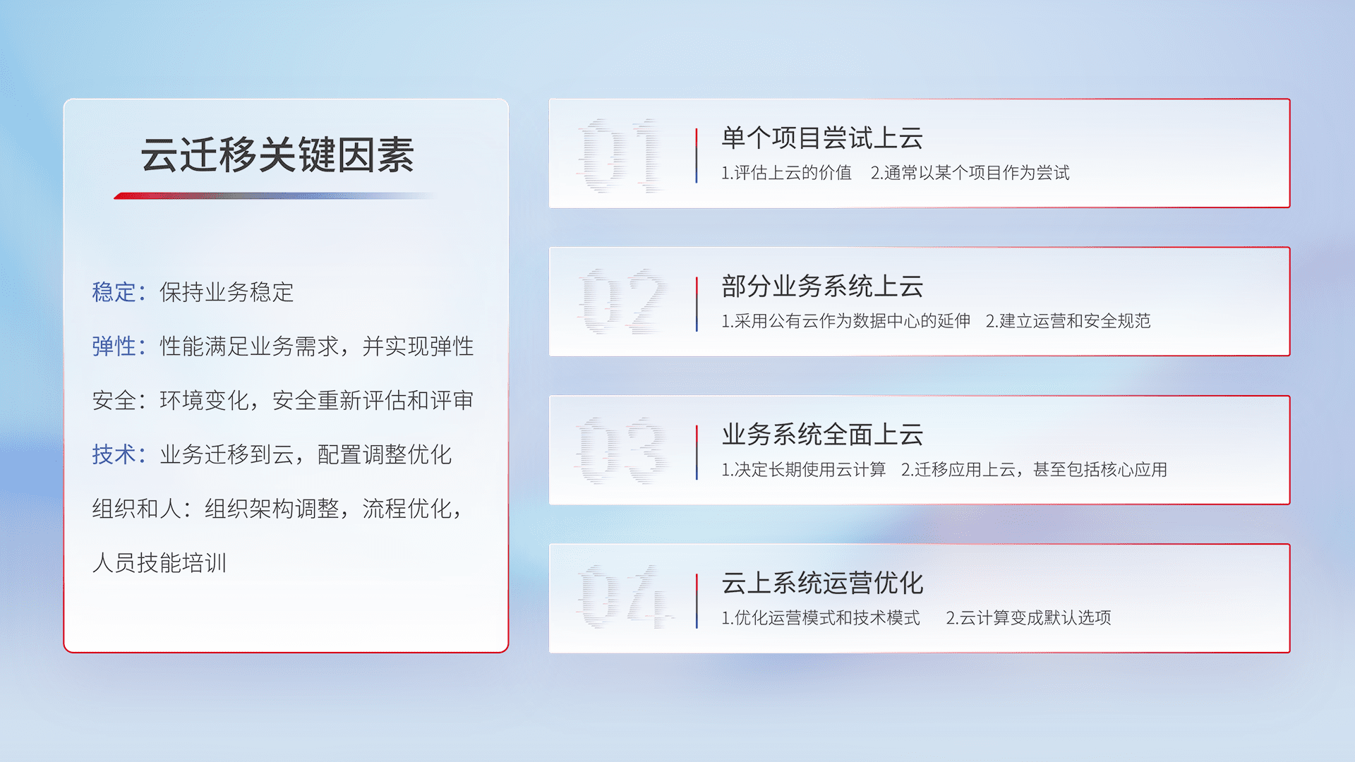 结合实际业务,,从规划设计、、、、云平台选型、、云原生改造、、、数据迁移、、、集成交付,,,迁移全过程为客户识别最佳上云路径,,,做好风险识别管理,,,,设计网络架构、、、、身份权限、、、、安全审计合规、、、操作审计、、、日志审计、、监控告警策略、、多站点容灾设计等,,,对云上基础设施进行整体规划,,,提升IT治理水平,,以满足弹性、、、高可用、、、、高性能的需求。。