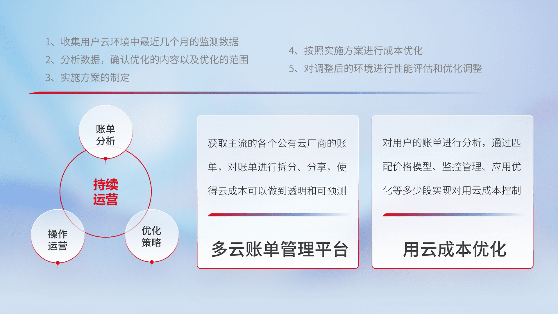 通过多云纳管,,,以统一的资源数据模型把客户的云资源进行抽象和封装,,进而实现对多云资源的统一操作,,,保障云资源管理的可靠性、、稳定性与可用性。。。。量身定制化运维内容,,配置、、、、开发运维、、补丁管理、、、、备份、、、监控、、认证和访问管理、、、、审计和日常巡检等,,保障在用云过程中的可靠度,,,稳定度以及高可用率。。。。